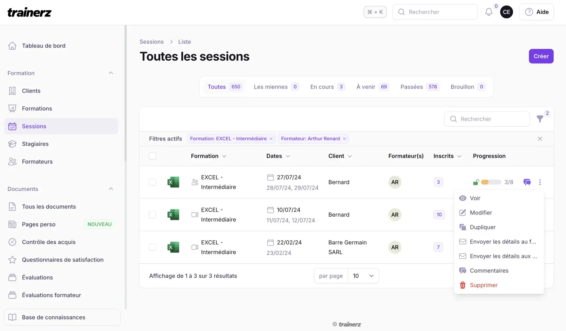 Créez des sessions, planifiez les dates, affectez les formateurs aux sessions, tout ça directement depuis le calendrier.